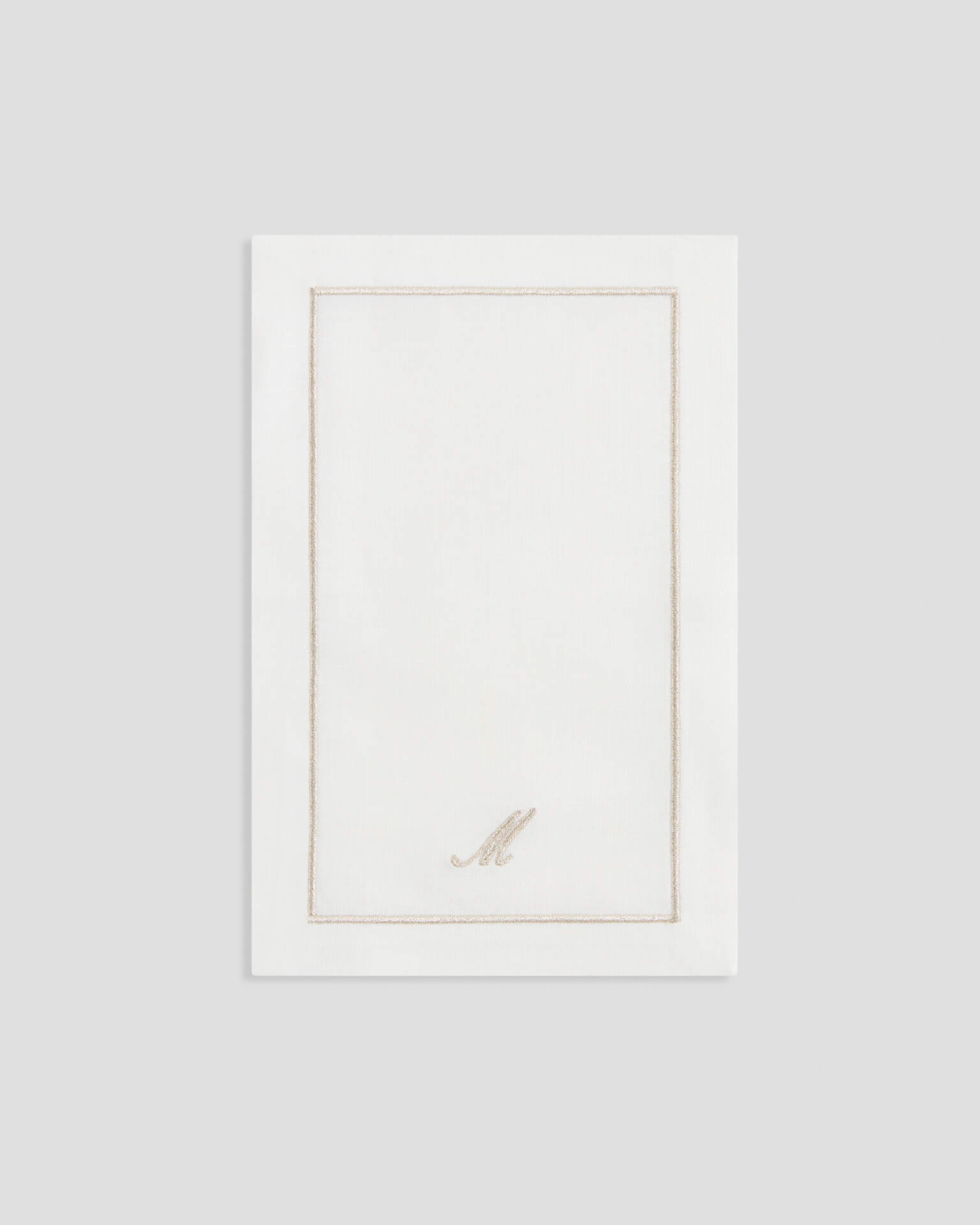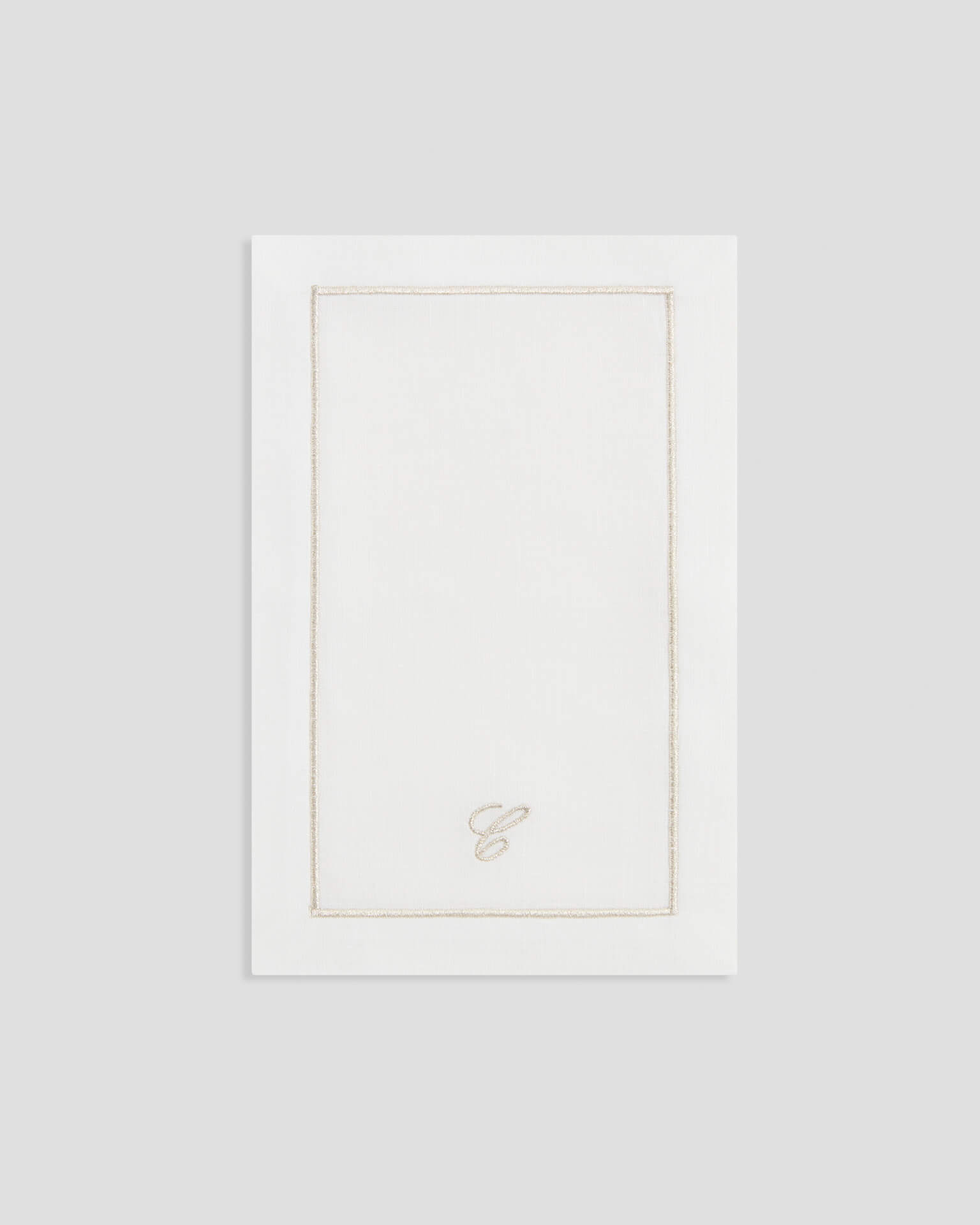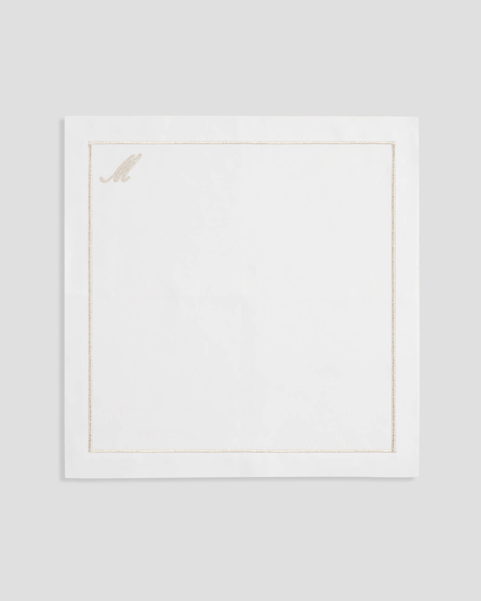 Collezione in puro lino pregiato composta da tovagliolini da cocktail, tovagliette e tovaglioli da tavola, rifiniti con elegante cordonetto. Le iniziali ricamate, disponibili in oro o argento, aggiungono un tocco di lusso personalizzato.