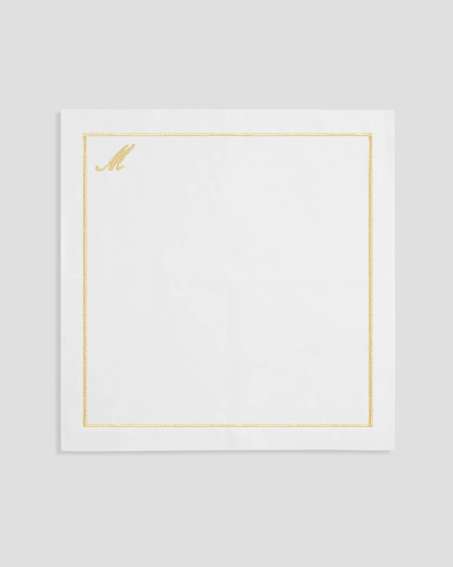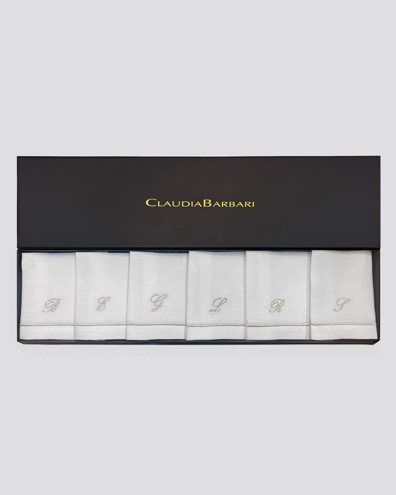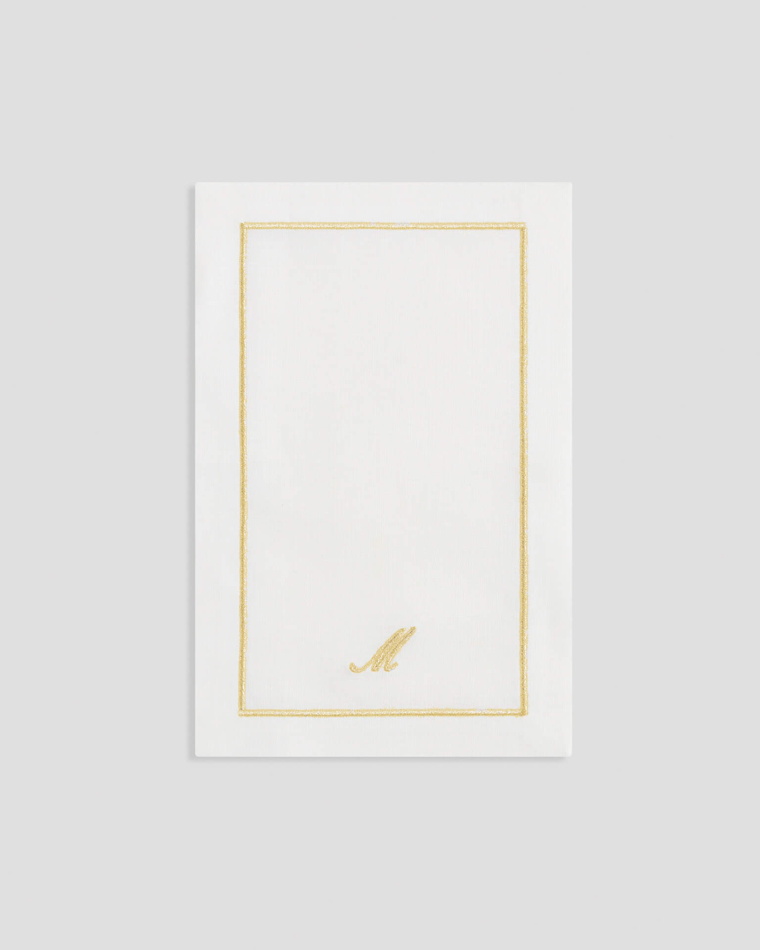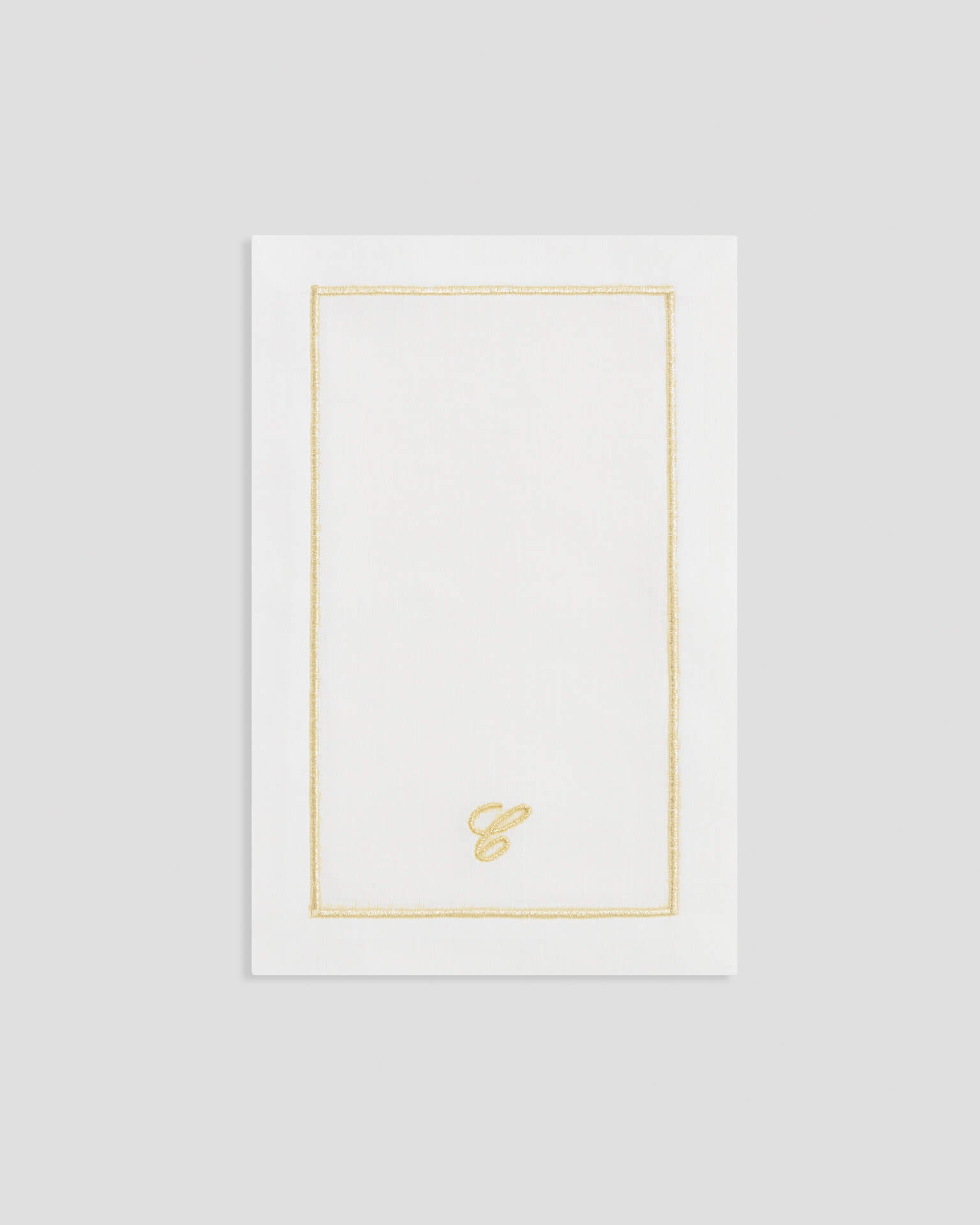 Collezione in puro lino pregiato composta da tovagliolini da cocktail, tovagliette e tovaglioli da tavola, rifiniti con elegante cordonetto. Le iniziali ricamate, disponibili in oro o argento, aggiungono un tocco di lusso personalizzato.